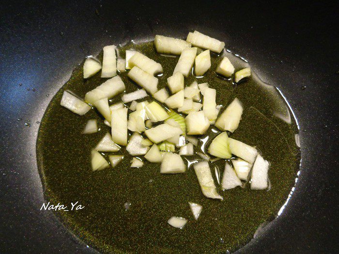 Половинку луковицы порежем и отправим в казан с оливковым маслом.