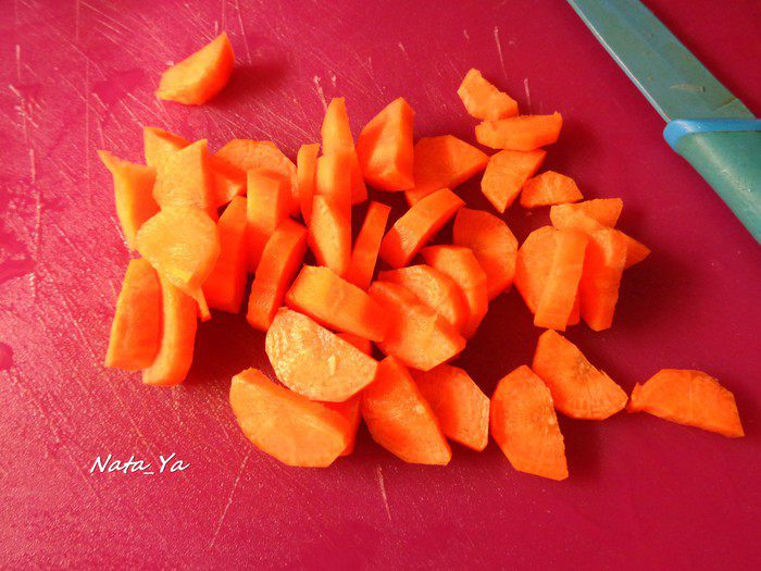 Батат очистим от кожуры и порежем средними кусочками. Отправим в казан.