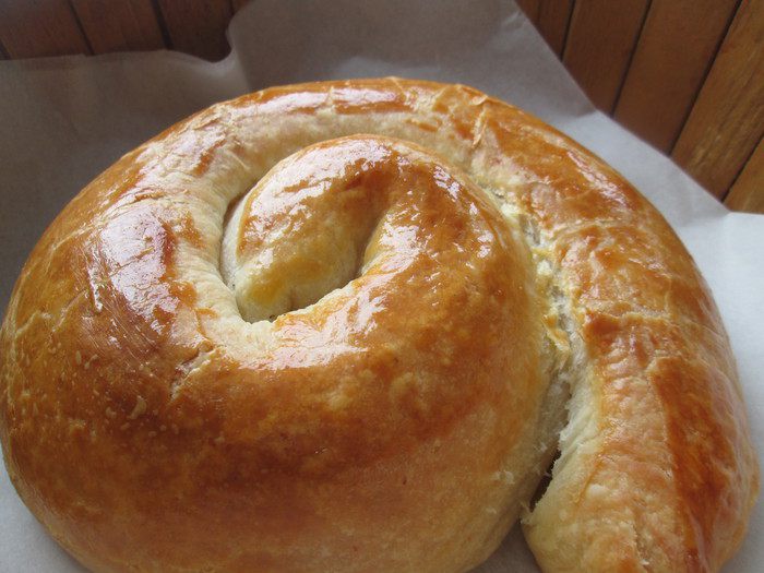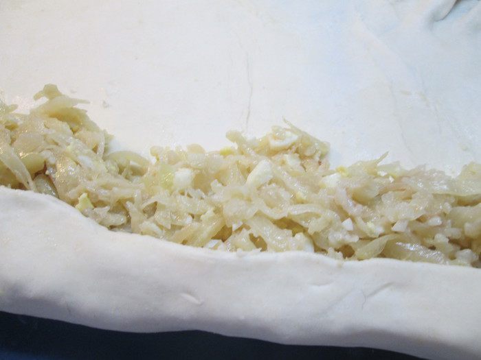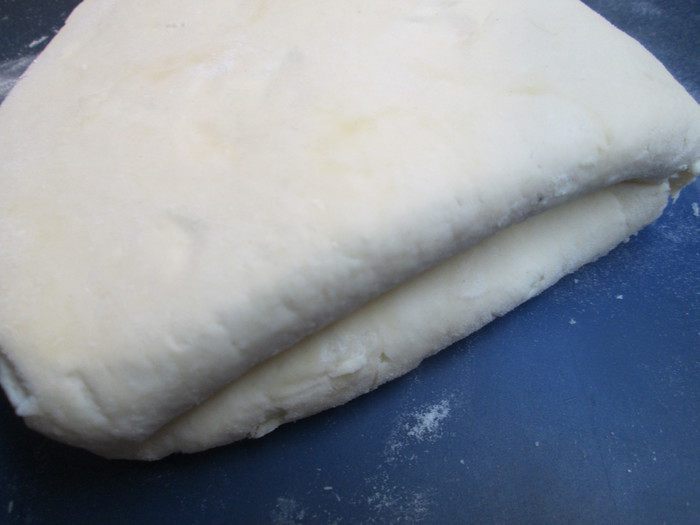 Затем складываем тесто 2 раза пополам (в четыре слоя) — и снова раскатываем.
