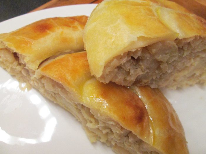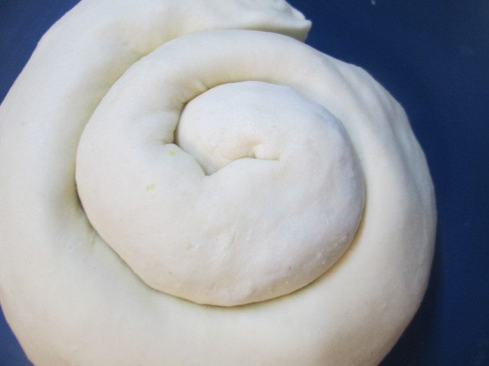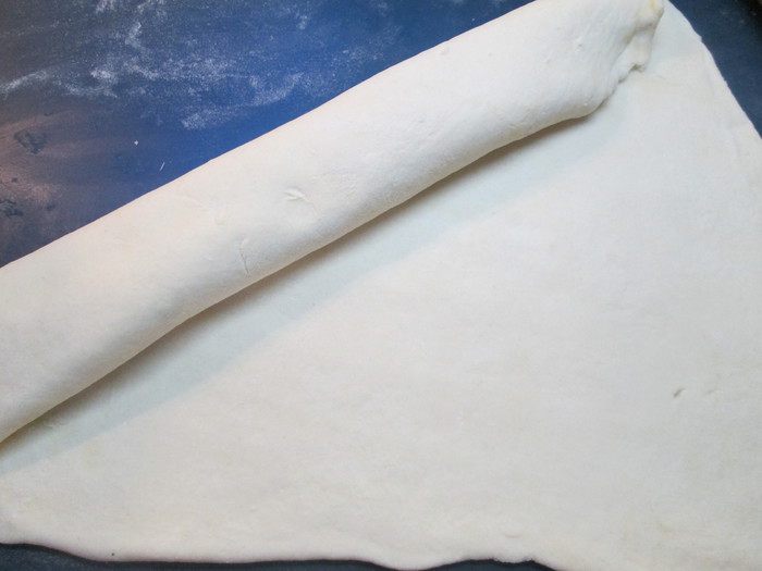 Через 12 часов достаем тесто из холодильника, даем немного согреться и раскатываем его, свернув его сначала в три слоя, т.е. делим тесто мысленно на три части, укладываем один край до середины пласта и сверху накрываем другим. Раскатываем снова в пласт, приблизительно 40х50.