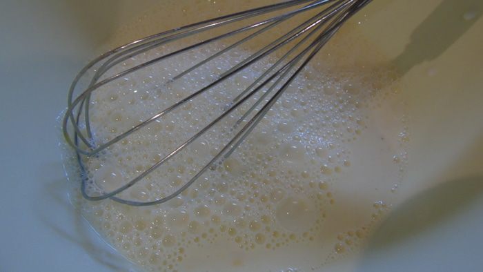 Кефир взбиваем венчиком с яйцами и молоком.