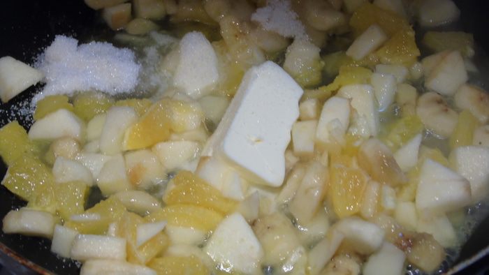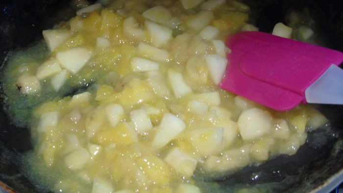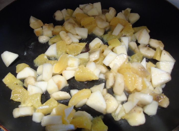 На сковороду выкладываем фрукты, предварительно слив сок, он нам пригодится чуть позже, и тушим на растительном масле на среднем огне, до мягкости яблок, но следите, чтоб они не превратились в кашу.