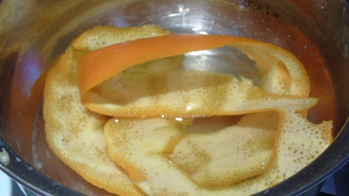 С апельсинов снимите кожуру по кругу, сложите в сотейник, залейте водой так чтоб она покрывала кожуру, добавьте ложку сахара и варите 5 минут. Достаньте из воды и кожуру будет легко нарезать на полосочки, которыми потом завяжем блины.