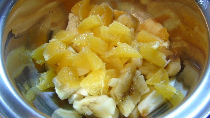 Яблоко, банан и апельсин очищаем и нарезаем кусочками. Даем постоять, чтобы апельсины пустили сок.