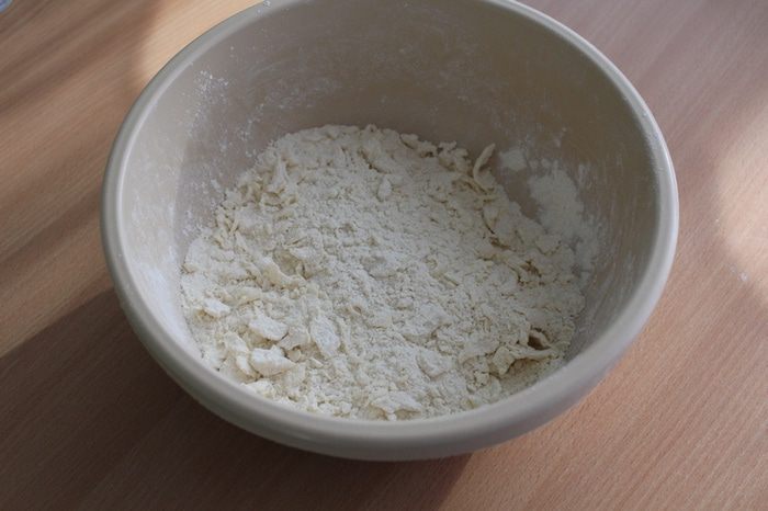 Холодное масло перетереть руками с мукой и сахаром до состояния крошки.