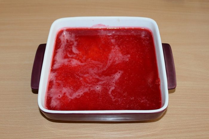 Залить горячий корж ягодным желе. Полностью остудить и убрать в холодильник на 1 час или более.