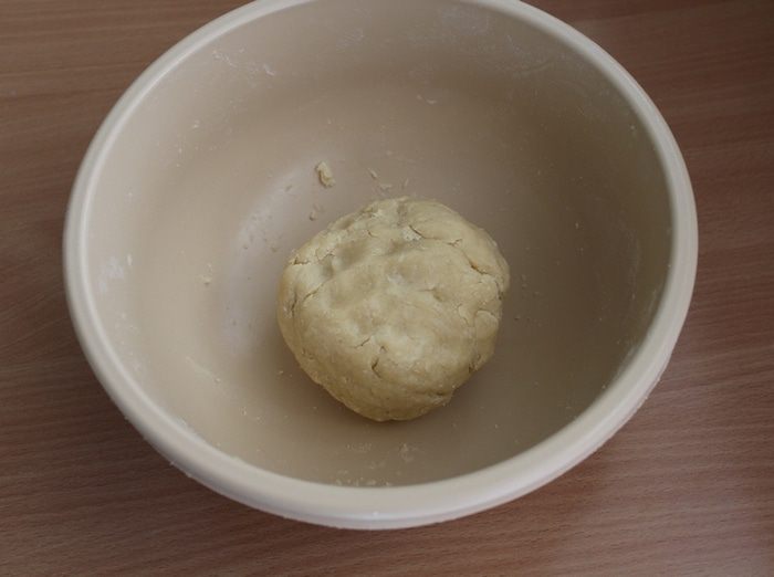 Добавить немного холодной воды, собрать тесто в шар и отправить в холодильник на 30 минут.