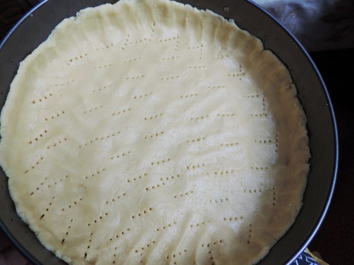 Распределяем тесто по поверхности, формируя бортик чуть больше 2 см, накалываем вилкой.