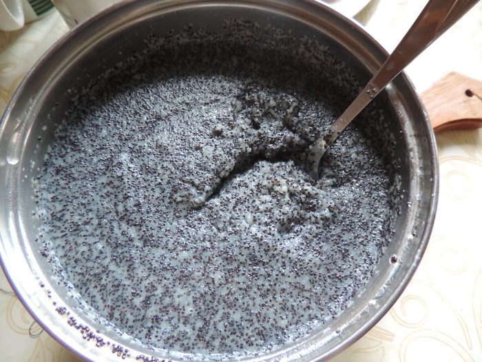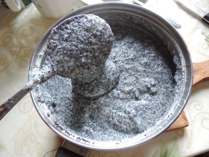 Первым делом займемся начинкой. Молоко, мак, манку, сахар и сливочное масло, нарезанное кубиками, сложить в сотейник. На слабом огне довести до кипения при постоянном помешивании. Когда масса закипит — снять сотейник с огня.