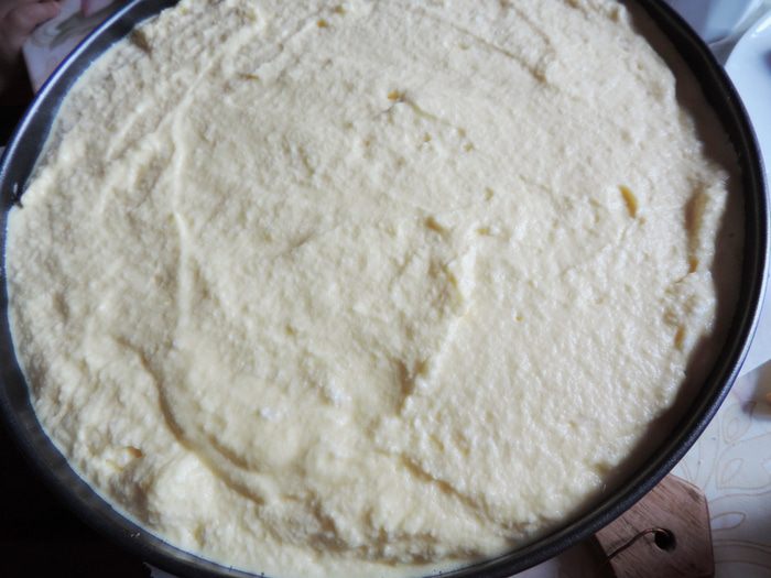 Распределяем заливку по пирогу и снова отправляем пирог в духовку еще на 30-40 минут. Заливка должна "схватиться", но не дайте ей подгореть.