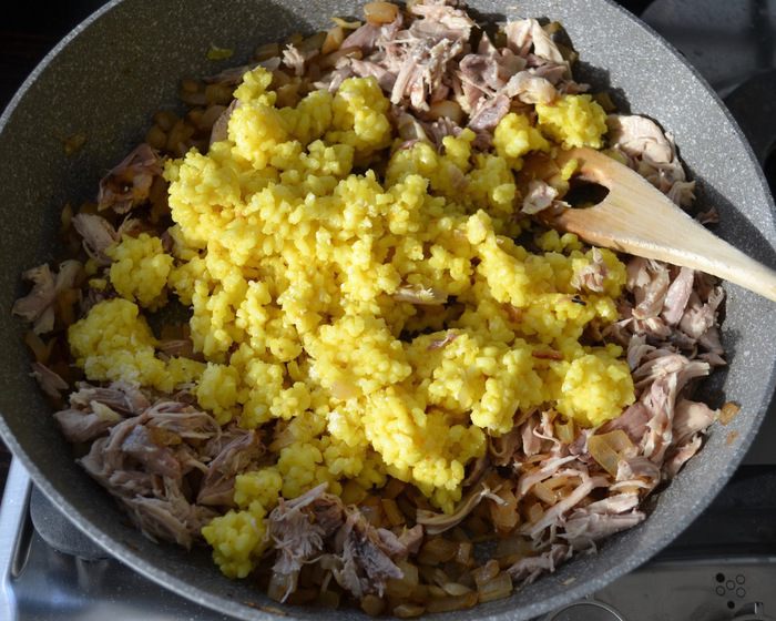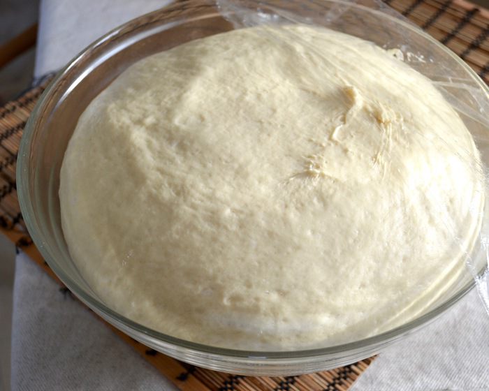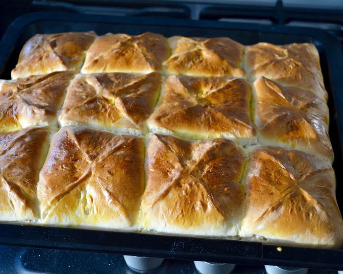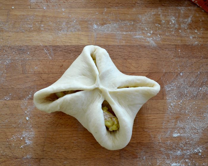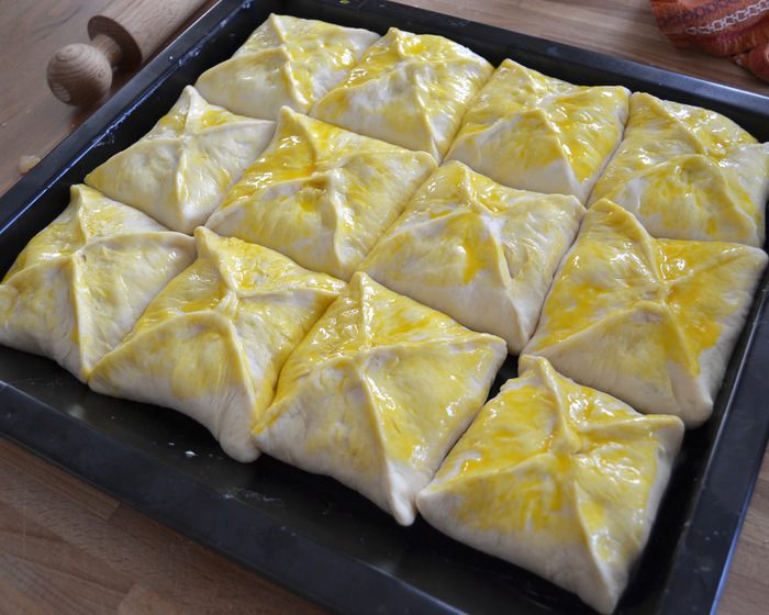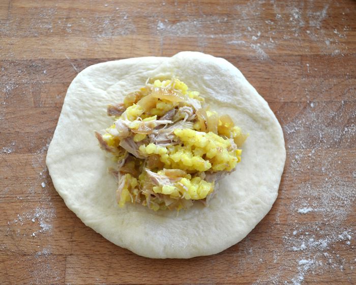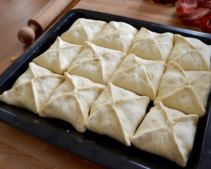 Уложить все подготовленные таким образом кусочки теста на противень (28-30 см) достаточно плотно друг к другу. Можно оставить пирог на расстойку еще на 20 минут, пока будет разогреваться духовка. Я этого делать не стала... Просто, несмотря на то, что процесс формирования пирога не отнимает много времени, но в процессе лепки последующих кусочков теста, уже готовые с начинкой продолжают расти на глазах, т.ч. мне даже перед смазыванием пирога яйцом захотелось еще раз пройтись пальцами по швам-защипам на пироге, чтобы они лучше были видны уже на готовом пироге...