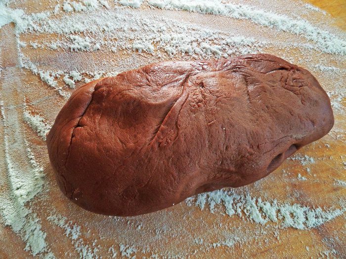 Вынуть тесто на доску с мукой, умять. Оставить тесто минут на 15.