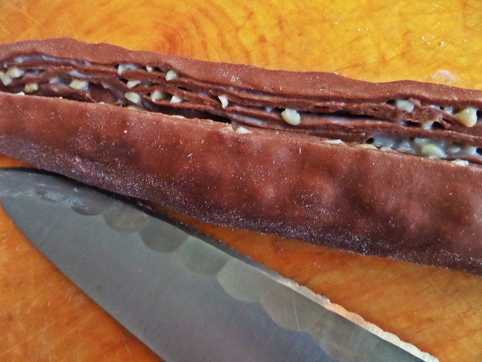 Отступив от одного конца пару см, надрезаем рулет по всей длине.