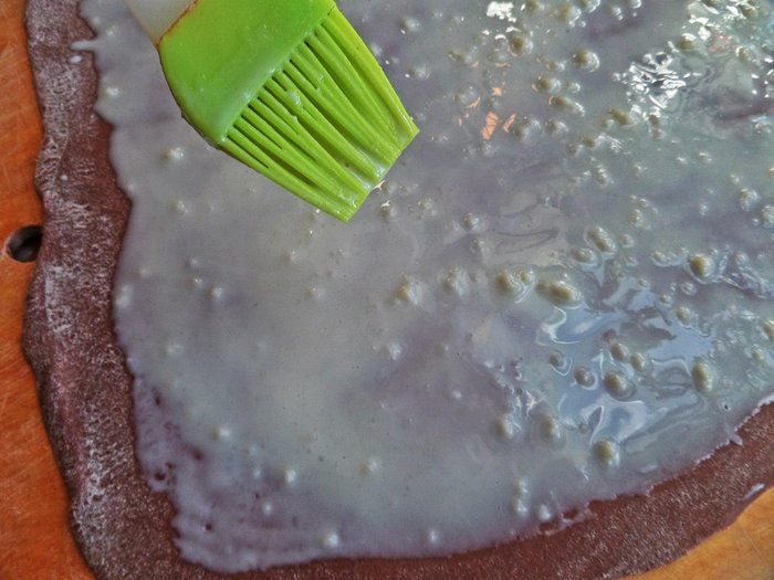 Наносим начинку кисточкой на пласт, но не до краёв.