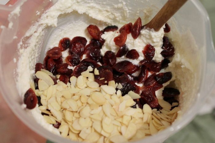Миндальные лепестки слегка обжарить на сухой сковородке (без добавления масла!). В творожную массу добавить миндальные лепестки, вяленую клюкву, перемешать.