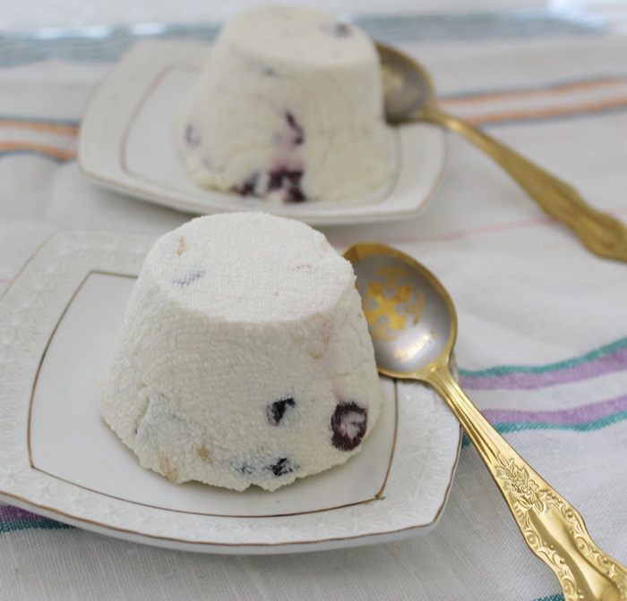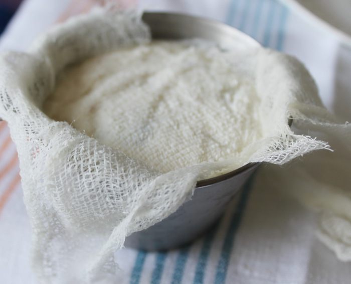 Формочки (у меня 4 диаметром) выстелить в три слоя чистой марлей, заполнить творожной массой. Свисающими концами марли накрыть творог, сверху поставить груз (это может быть чашка или стакан с водой) и поставить на 8 часов в холодильник.
