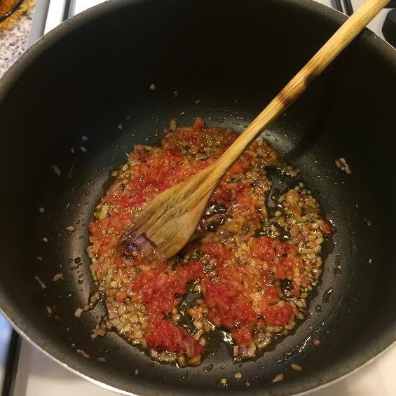 В кастрюле в которой будем готовить солянку потушить лук с томатом.