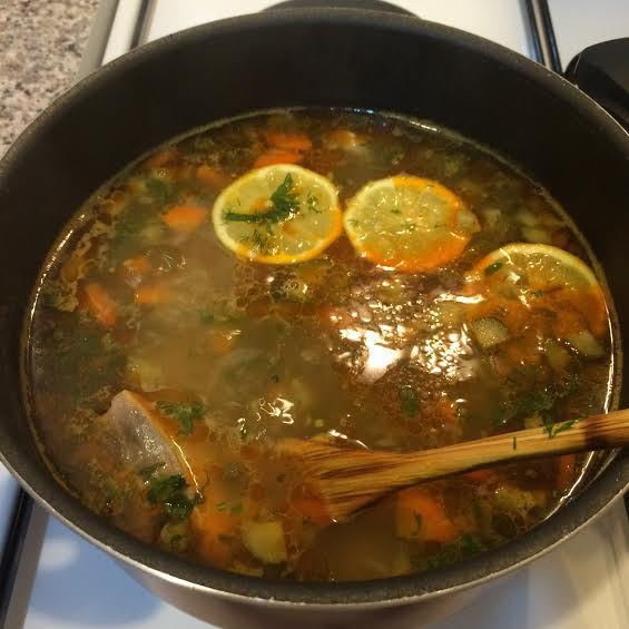 Добавить оливки и каперсы. Зелень мелко нарезать. Зелень и лимон добавить в суп. Посолить, поперчить и снять с огня.