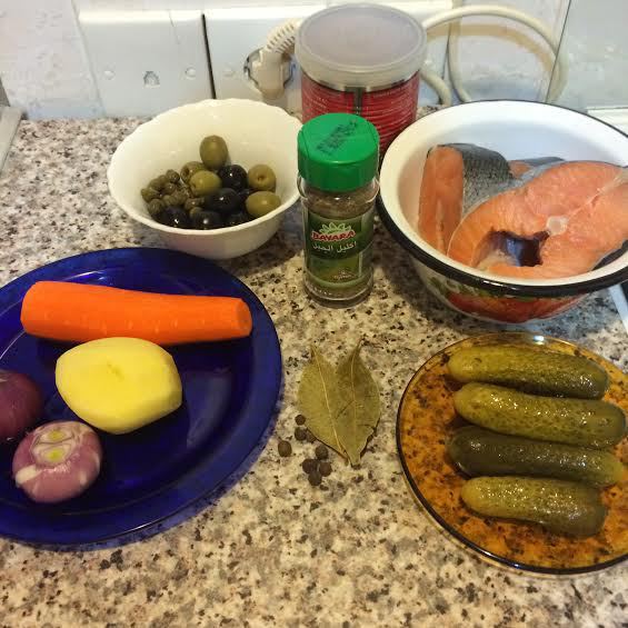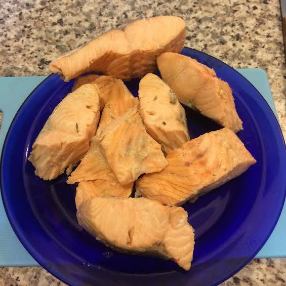 Три стейка семги (у меня маленькие) отварить с розмарином, лаврушкой и душистым перцем до готовности.