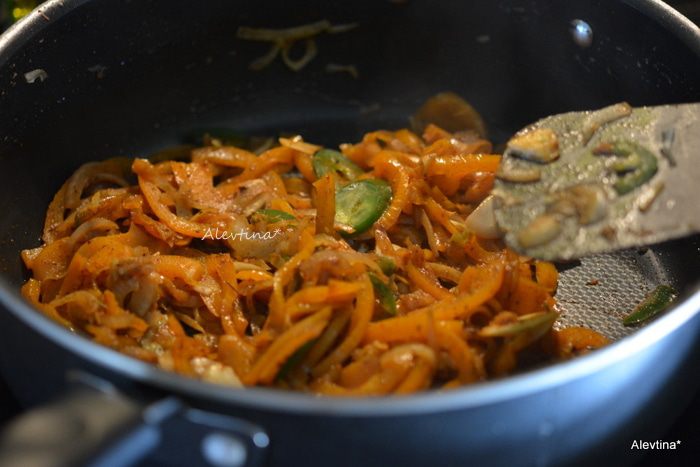Выложить на сковороду с 1 ст.л нарезанные тонко овощи как зеленый, красный сладкий перец, лук тонко порезанный, острый перец поблано. Готовить 5 минут, помешивая. Добавить перец халапеньо очищенный от семян, нарезанный колечками. Чеснок мелко нарезанный. Готовить 3-4 мин. Добавить чили перец порошком, орегано, кориандр, кумин, соль и черный перец по вкусу. Перемешать и готовить еще 1 мин.