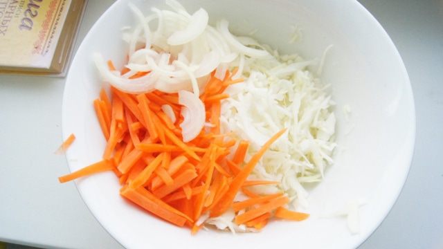 Капусту нарезать соломкой, морковь тонкими полосками, лук полукольцами. Все помять руками, полить лимонным соком, добавить щепотку сахара и перемешать. Убрать салат в холодильник на 10-15 минут, чтобы слегка промариновался.