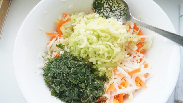Добавить к салату редьку, натертую на средней терке и рубленую зелень. Я взяла укроп и петрушку.