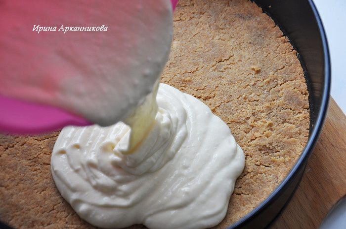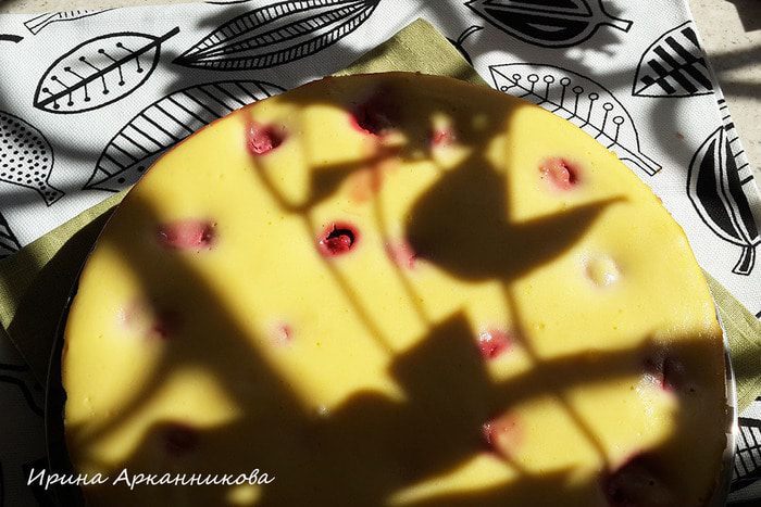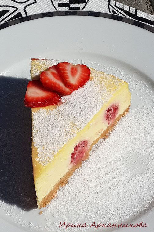 Сделать начинку. Смешать блендером творог, сахар и ванилин. По одному добавить 4 яйца, каждый раз, хорошо перемешивая массу венчиком. Получившийся творожный крем вылить в форму с коржом. Сначала вылить половину, выложить свежую клубнику. Затем вылить остальную начинку.