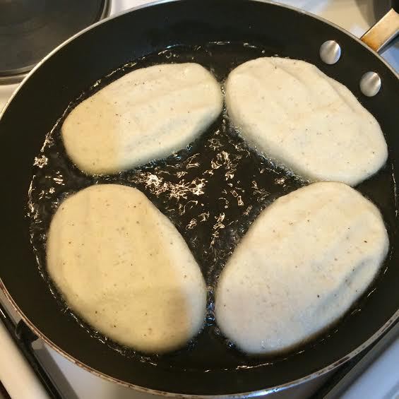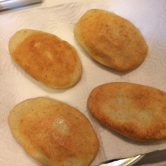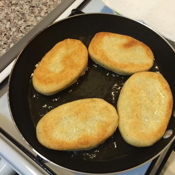 Смачивая руки водой, сформировать мчады. Жарить первую строну, накрыв крышкой, до румяной корочки на среднем огне.