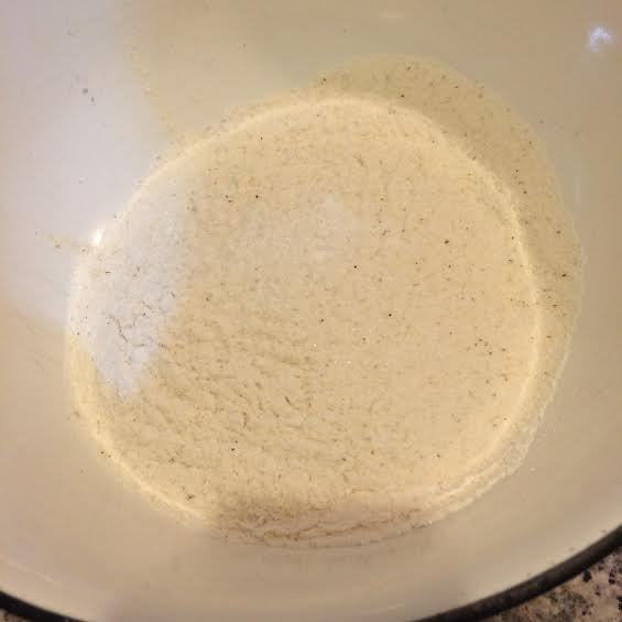 Кукурузную муку просеять добавить соль, сахар и соду.