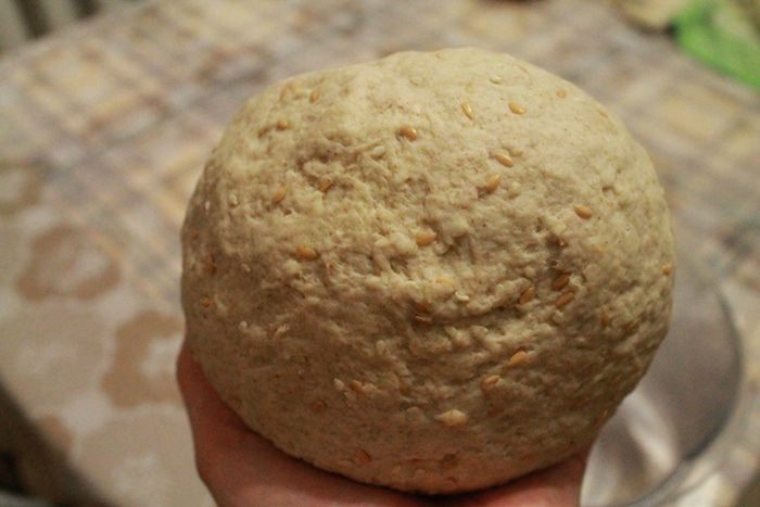 Положить тесто в миску, затянуть пленкой и убрать в теплое место на час. Я поставила в духовку с включенной лампочкой.