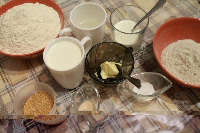 Замешиваем тесто. Просеять муку, влить воду со сливками и добавить дрожжи. Добавляем остальные продукты и замешиваем тесто. Вначале оно слегка липнет, но через минуту уже мягкое и приятное для рук.