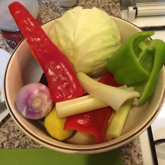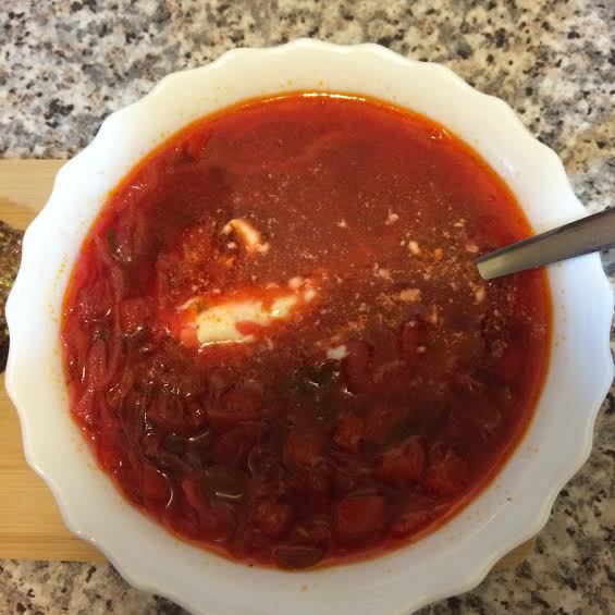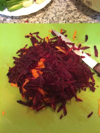 Пока это все тушится на медленном огне, натираем на крупной терке морковь, свеклу и добавляем в кастрюлю и перемешиваем, затем добавляем нарезанный кубиками картофель. Заливаем это все 2-я литрами горячей воды, накрываем крышкой и варим на медленном огне 5 минут. Нарезаем соломкой капусту и спустя 5 минут добавляем в кастрюлю. Варим все 10 минут.