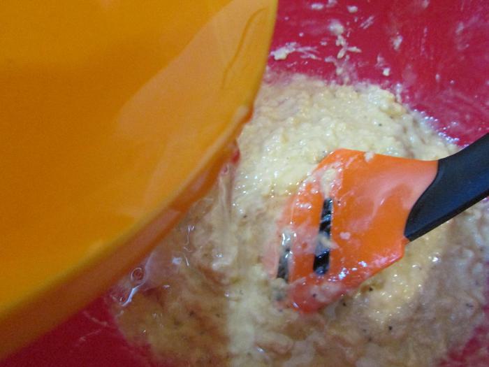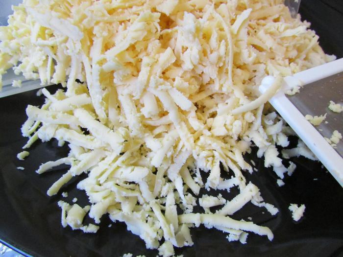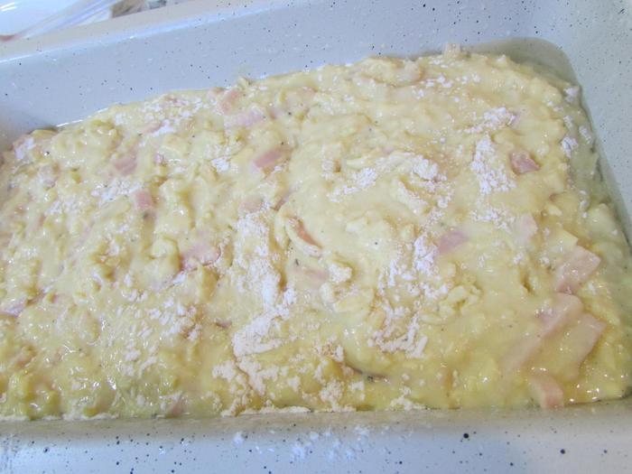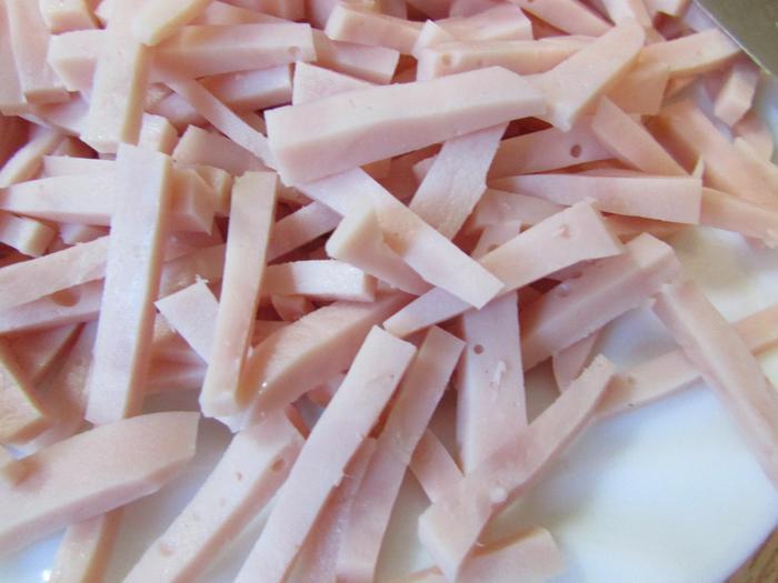 Затем добавить сыр и ветчину. Ещё раз тщательно перемешать.