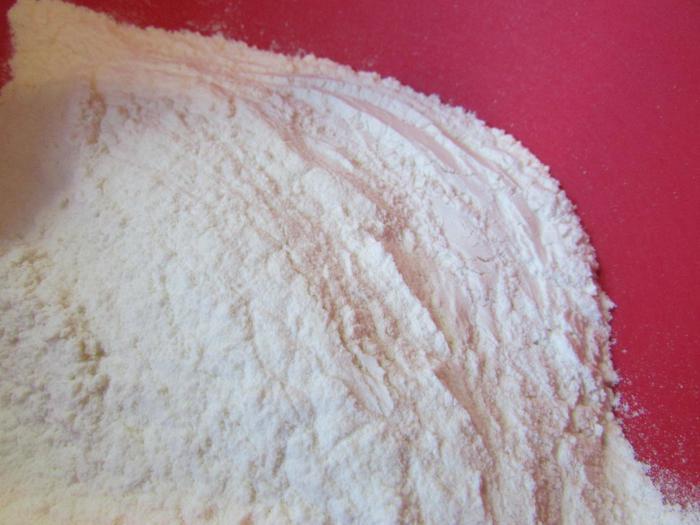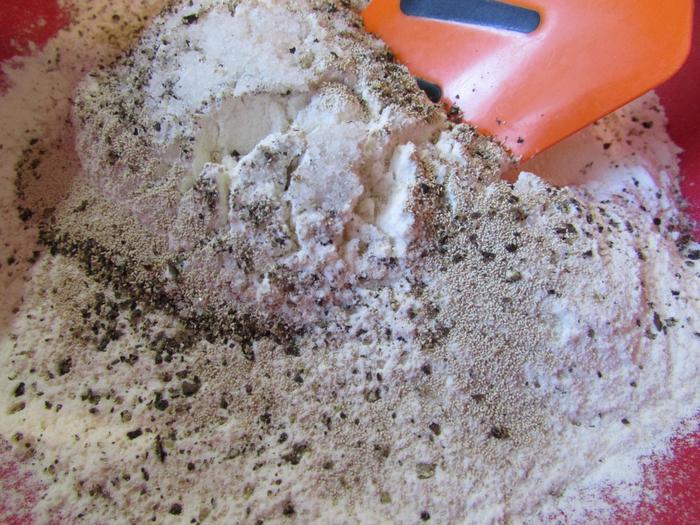В отдельной миске смешать вино и растительное масло. И хорошо перемешать с мучной массой.
