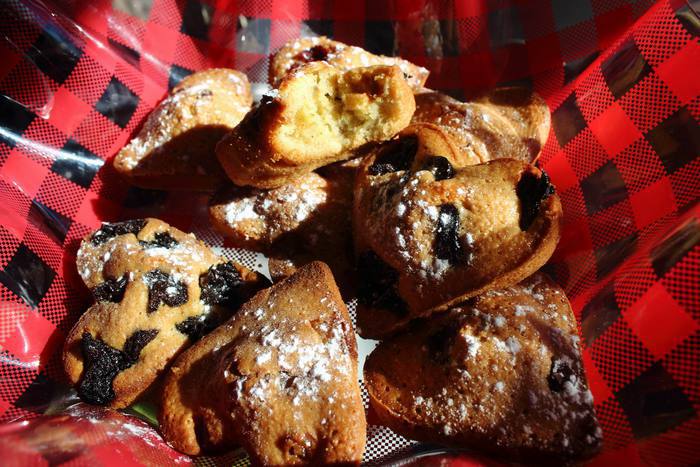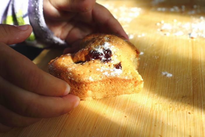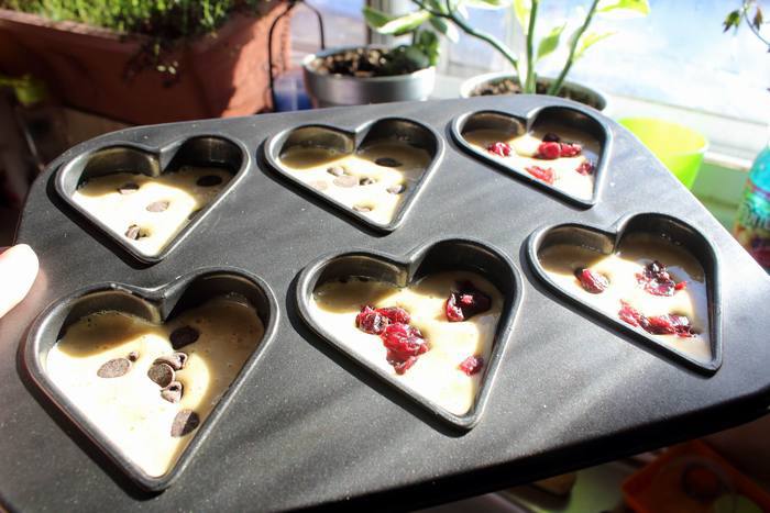 Залить в формочки на половину, уложить в каждую печенюшку свою начинку — я в это раз брала клюкву, шоколадные капельки, чернослив и ананасовые цукаты, захотелось разнообразия. Отправляем в духовку на 10-20 минут (смотреть по готовности).