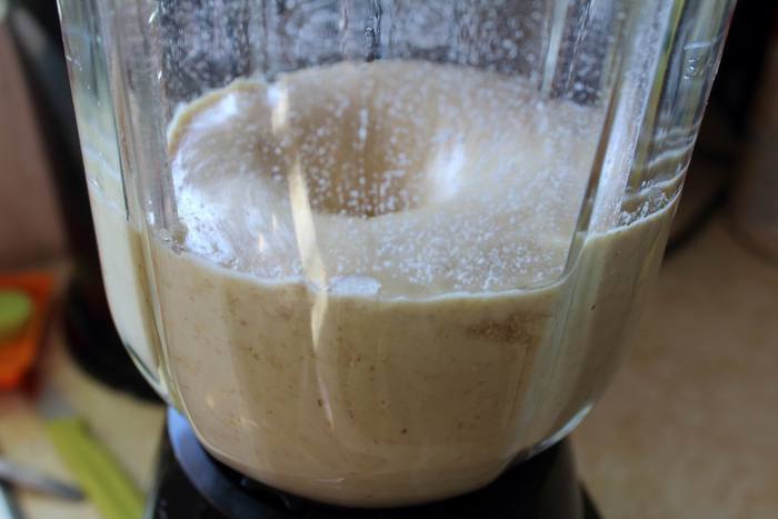Засыпаем все в блендер (можно все сразу, можно сначала слегка перемолоть хлопья, если они не быстрого приготовления). Включаем, измельчаем, смешиваем — тесто готово.