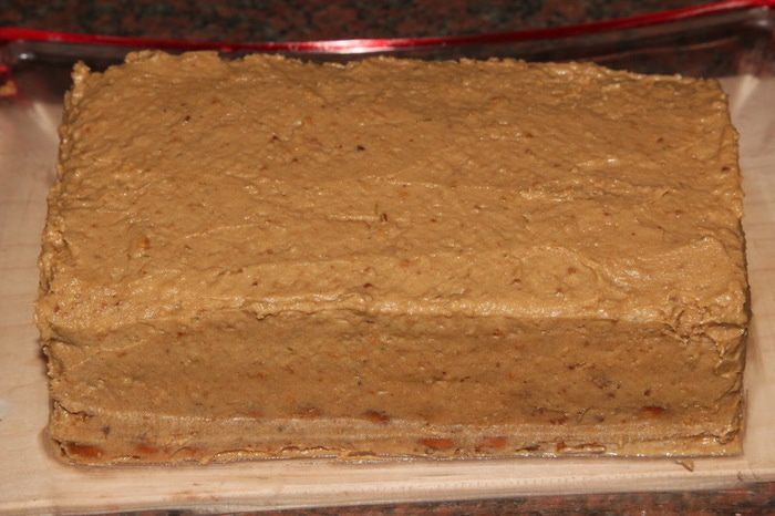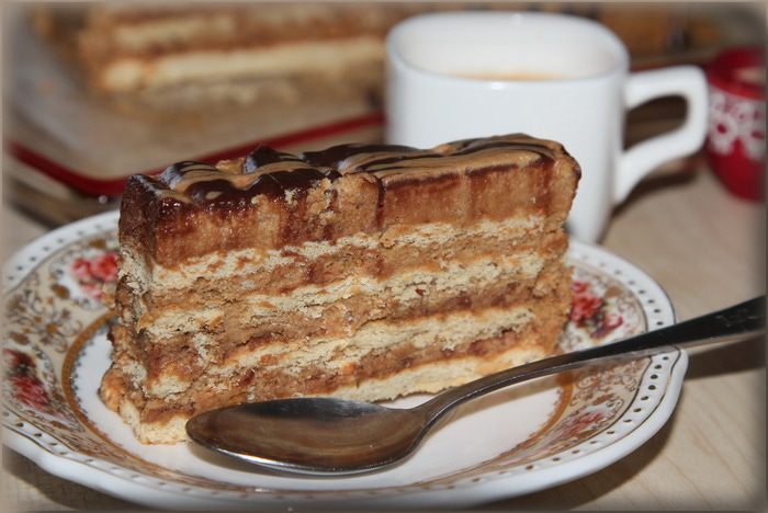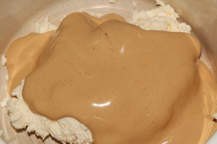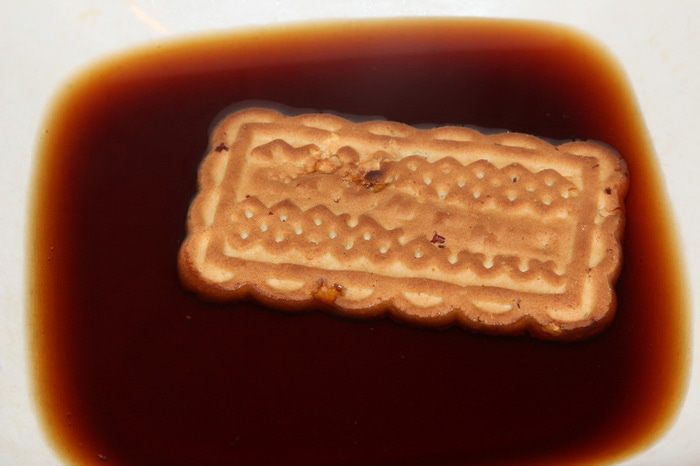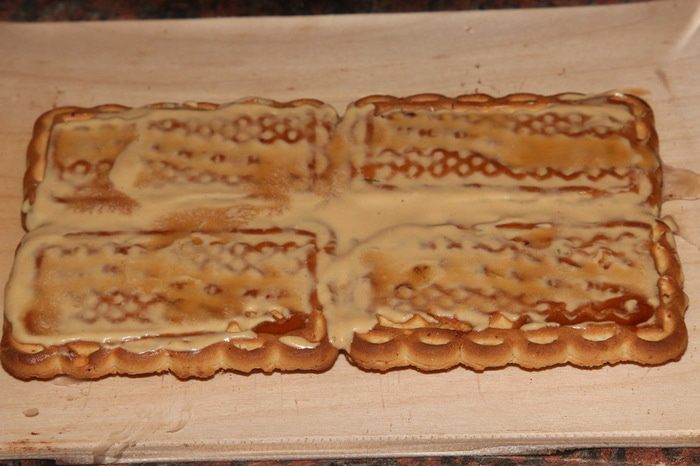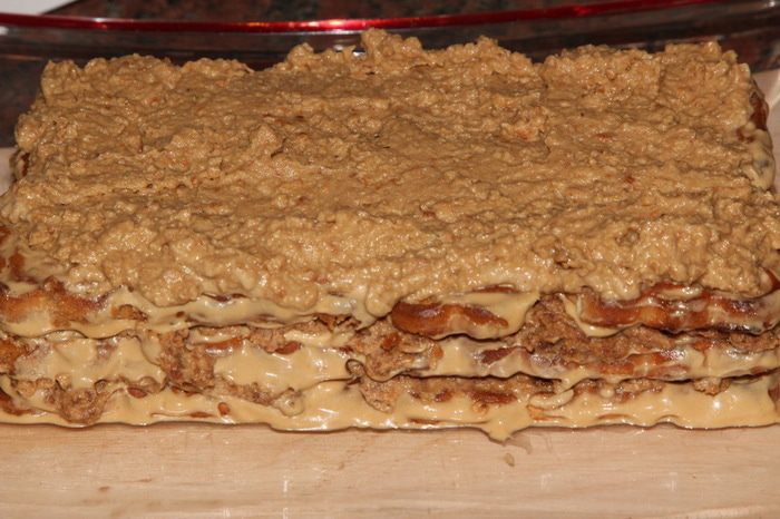 И вот сама сборка. Тут я окончательно убедилась, что ничего из этого мероприятия не получится. В только что сваренный кофе добавляем сахар по вкусу, размешиваем, выливаем в глубокую тарелку и добавляем коньяк. Берем 4 печенья, смазываем края кремом, укладываем в два ряда и поливаем сверху кофе. Крем сразу начал таять и расползаться по блюду, а печенья упорно разъезжались в разные стороны. В панике было принято волевое решение: из холодильника достала 2 вафли, измельчила их блендером до состояния мелкой крошки. Точно так же отдельно измельчила 4 печенья. Отдельно отложила 4 столовые ложки крема, остальной крем разделила на две части. В одну часть добавила вафельную крошку, а в другую крошку из печенья. Хорошенько все вымешала и поняла: вот оно! Извините, но сфотографировать в спешке забыла.
