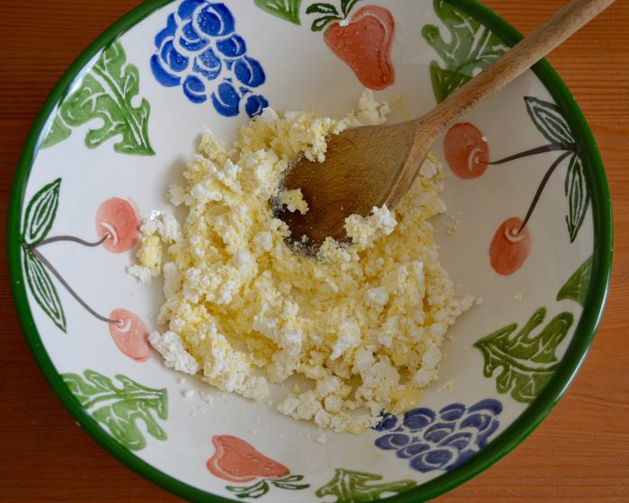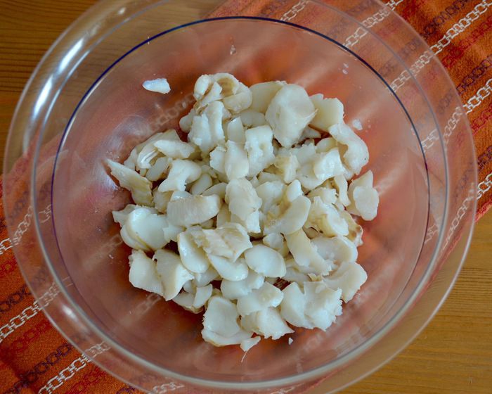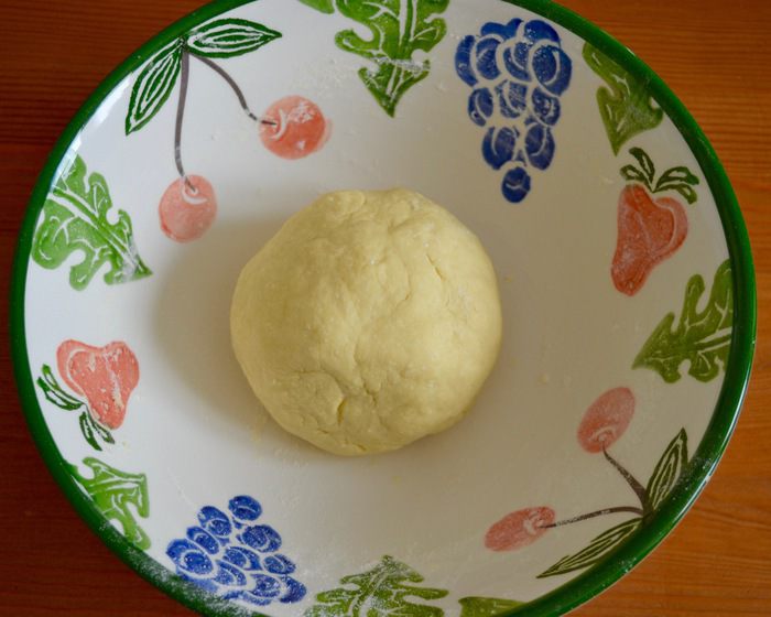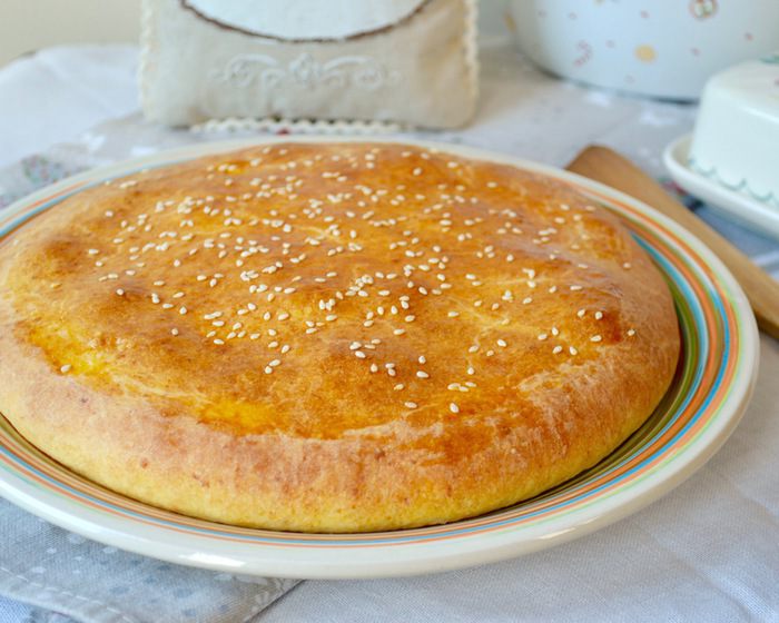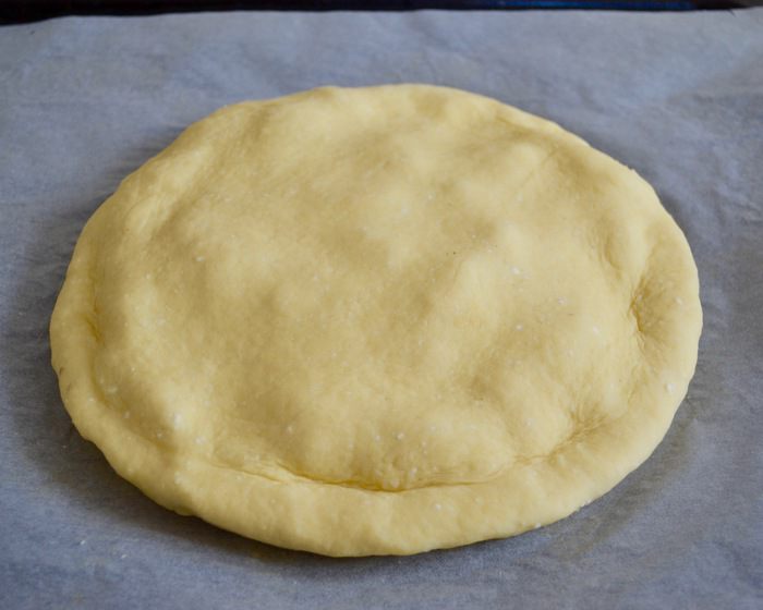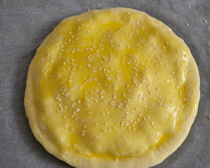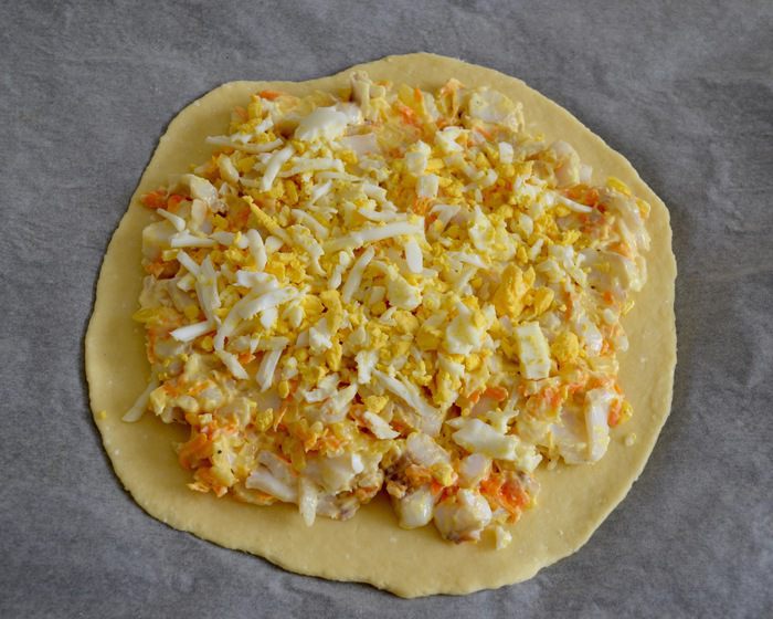 Тесто разделить на 2 части. Одну часть раскатать в лепешку диаметром 20-22 см, выложить на противень, застеленный пекарской бумагой. Сверху выложить рыбную начинку. А затем — слой из натертого на крупной терке яйца...