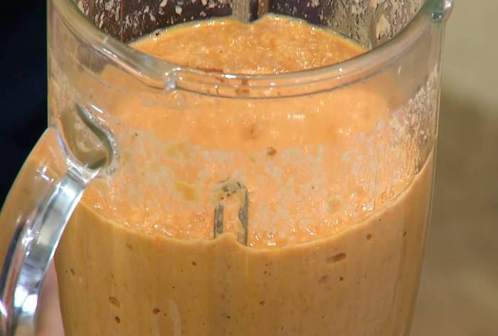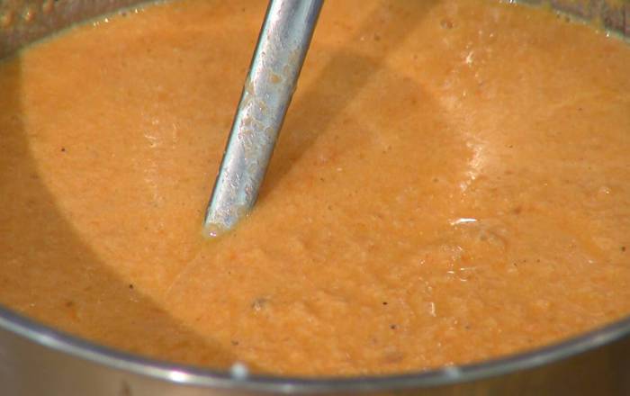 Поместить рыбу в блендер, добавить обжаренные овощи, влить 3 половника рыбного бульона и все взбить. Затем влить еще 4–6 половников бульона, посолить, поперчить, добавить пеперончино и все еще раз взбить на медленной скорости.