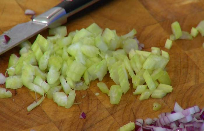 Сельдерей мелко нарезать.