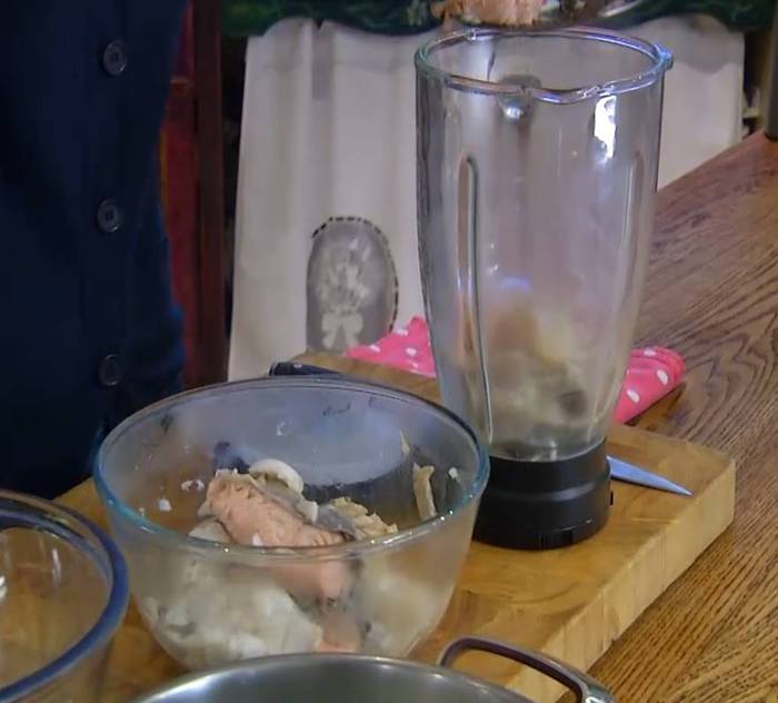 Готовую рыбу вынуть из бульона и отделить от кожи и костей.