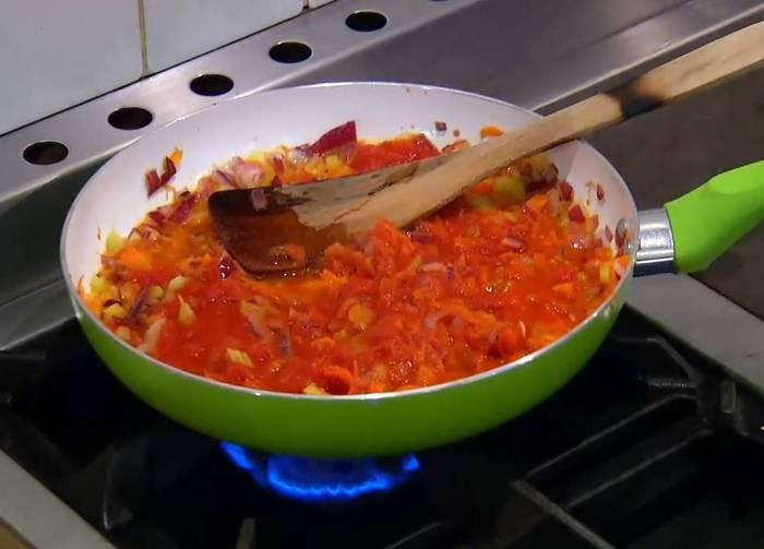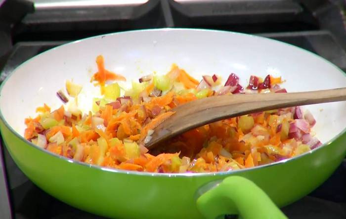 Разогреть в сковороде оливковое и сливочное масло и обжарить все овощи на медленном огне до готовности.