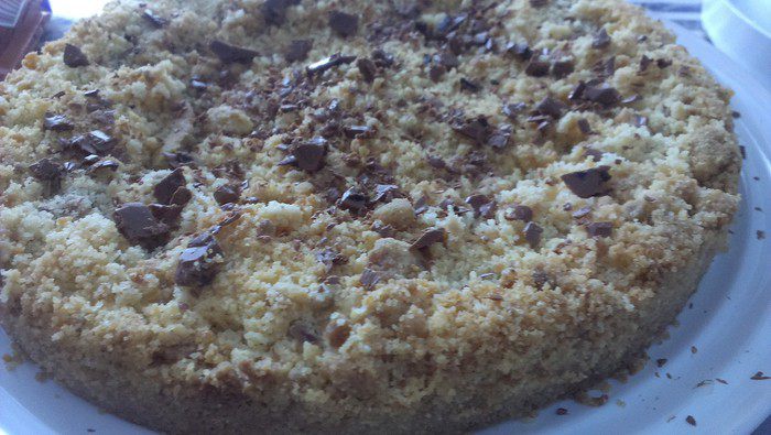 Размягченное при комнатной температуре сливочное масло (или маргарин) перетираем со стаканом сахара и 2 стаканами муки до состояния крошки. Туда же добавляем щепотку соли, чайную ложку разрыхлителя, ванилин и измельченные грецкие орехи (по желанию). Орехи и ванилин можно заменить по желанию, например, цедрой апельсина, корицей, имбирем или мускатным орехом и т.д. по вашему вкусу и настроению.
