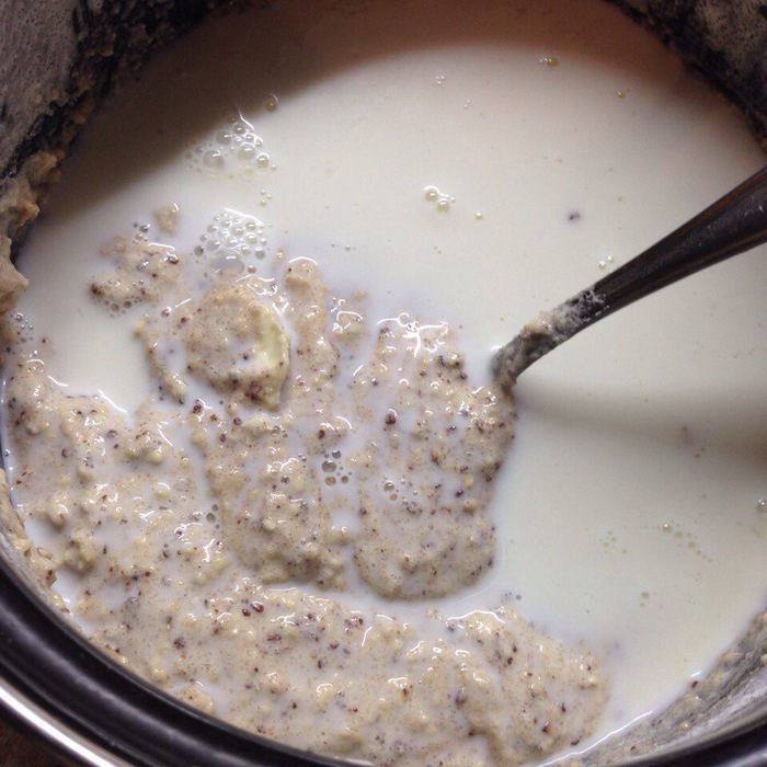 Добавить размягченное сливочное масло и молоко.