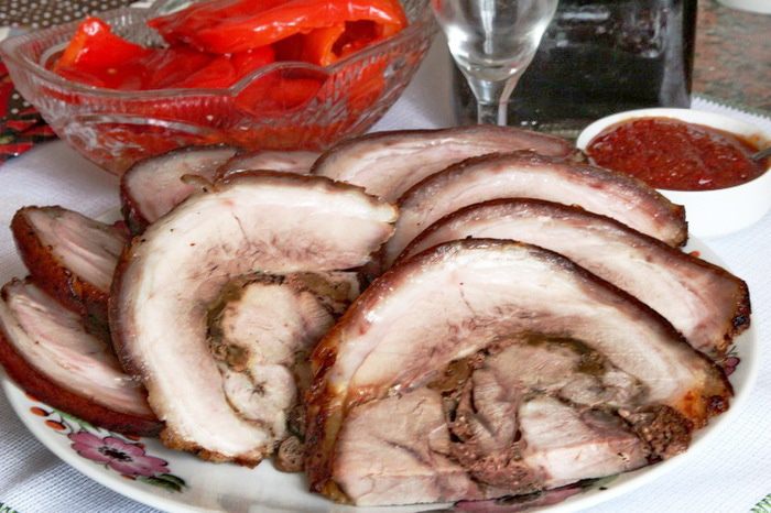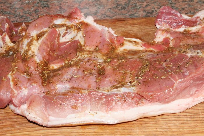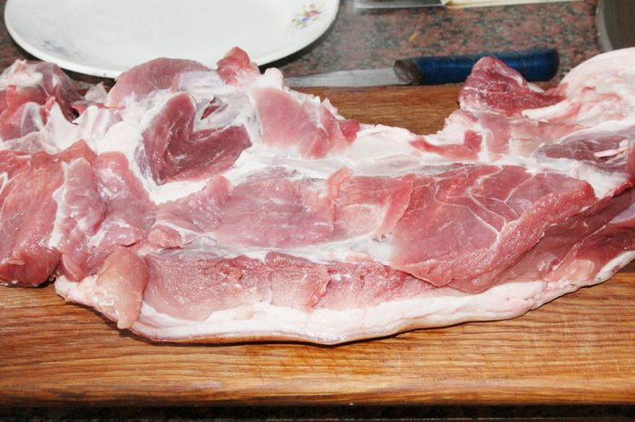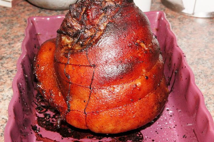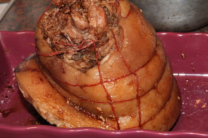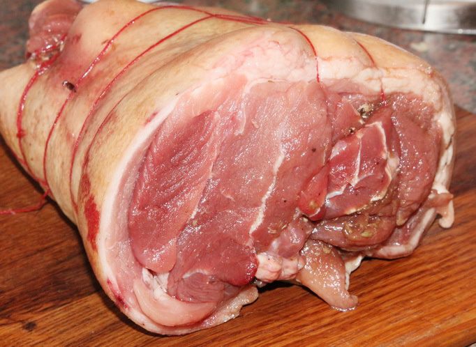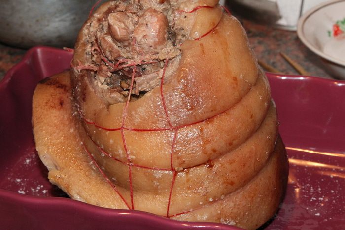 Вода в кастрюле уже закипела, опускаем туда. Ждем пока закипит, снижаем температуру и оставляем на 1 час. Вода не должна бурно кипеть, пусть чуть-чуть шевелится и все. Вот, через час вынимаем вот такую рульку. Остужаем до приемлемой температуры, где-то минут 15-20. Так, чтобы с рулькой можно было работать.