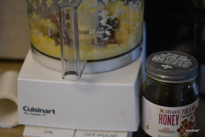 Порубить лимон в кухонном комбайне насадка нож. Добавить чуть меда. Перемешать.