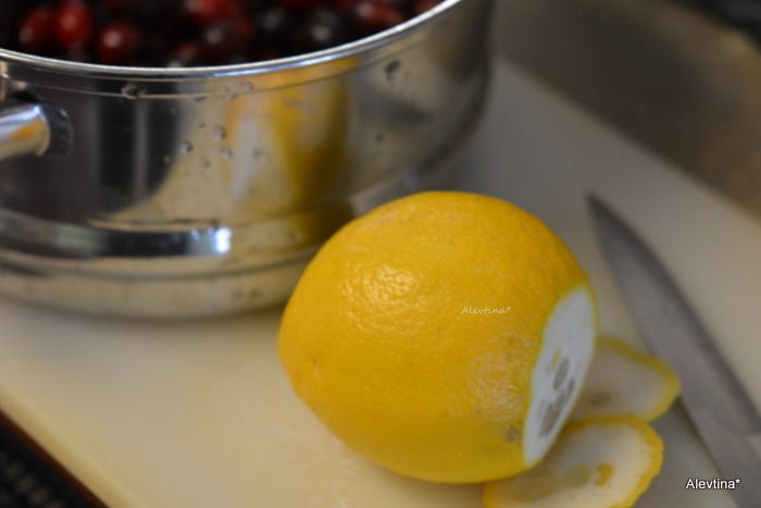 Клюкву свежую очистить, помыть. Кожуру лимона хорошо помыть, срезать с обеих сторон толстую кожуру, если имеется.