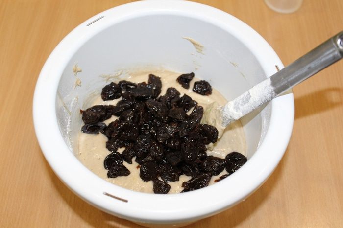 Замочить чернослив на два часа в коньяке. Просеять муку с содой или разрыхлителем.