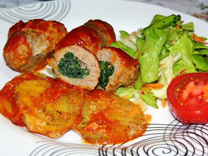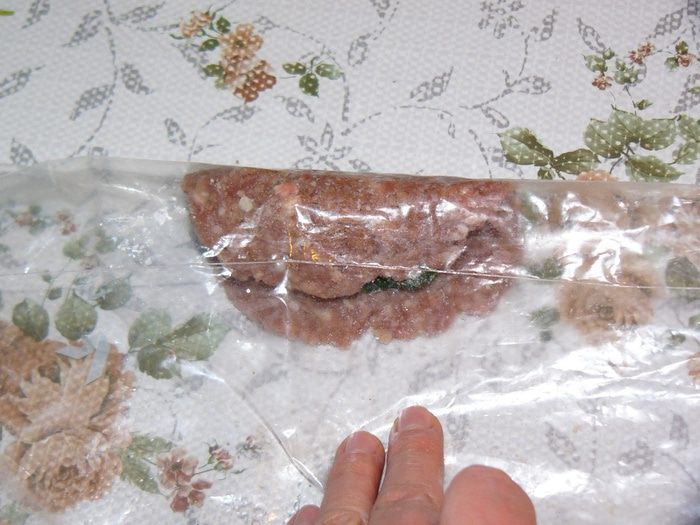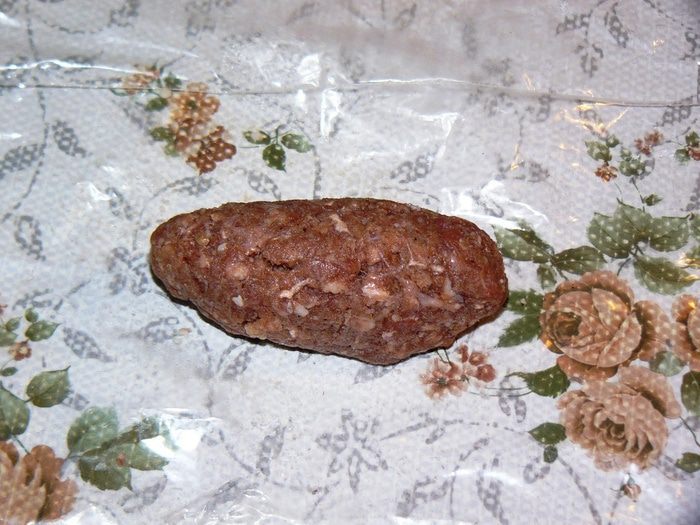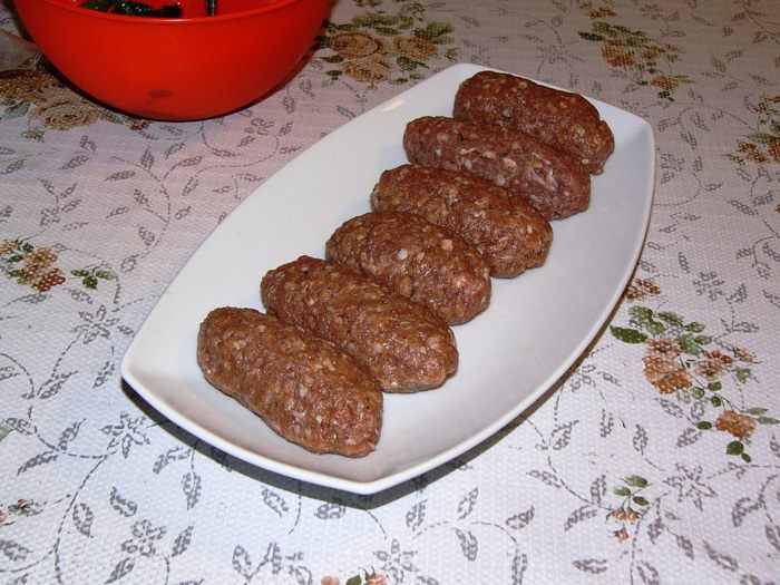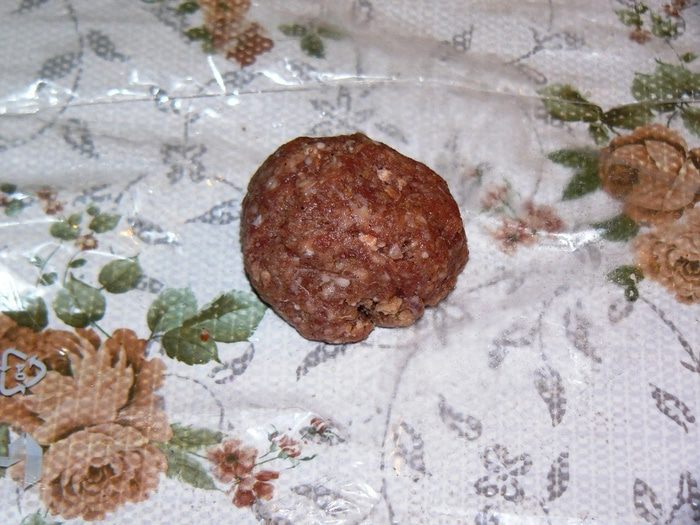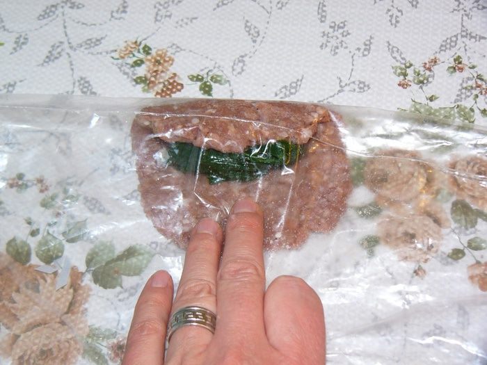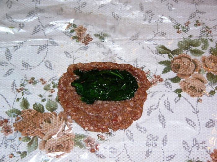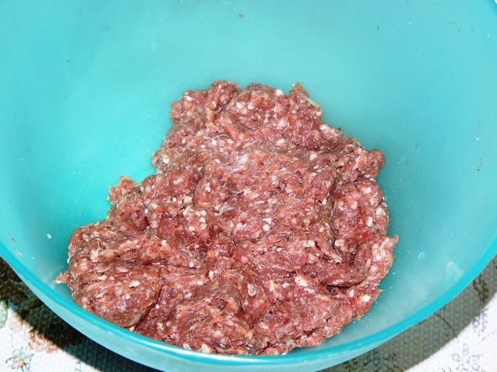 Теперь займемся фаршем для котлет. Надо очистить и измельчить лук. Добавить к фаршу лук, яйцо, хлебную крошку, специи, соль. Хорошо вымесить. На фото уже вымешанный фарш. Надеюсь, процесс перемешивания понятен. Забыла сфотографировать. Хочу заметить, что яйцо в котлеты я обычно не добавляю. Но в данном случае это уместно, потому яйцо придает эластичность и гладкость фаршу. Нам это пригодится на этапе заворачивания начинки.