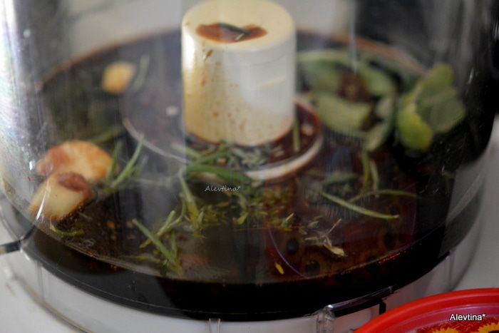 Смешать в однородную массу в кухонном комбайне (насадка нож): соевый соус, кетчуп, уксус, чеснок, растительное масло, розмарин, шалфей и тимьян.